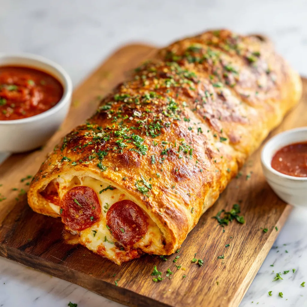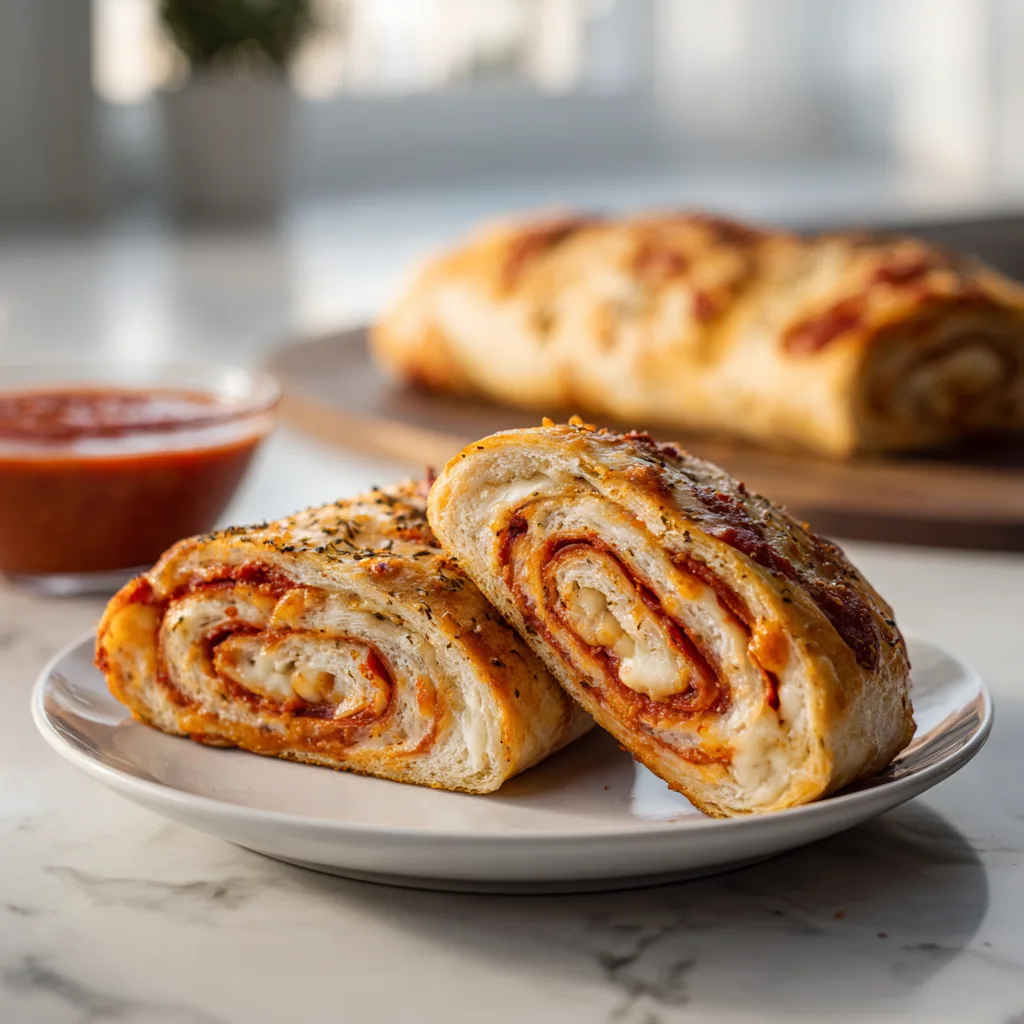 Cheesy pepperoni pizza stromboli is the ultimate “pizza night” remix: fast, crowd-friendly, and perfect for dipping. Nutritionally it’s rich, but you can lighten it by using part-skim mozzarella, adding vegetables, or serving smaller slices alongside a big salad. Keep the sauce thick, roll tight, vent the top, and you’ll get crisp, golden slices with gooey pizza flavor every time.