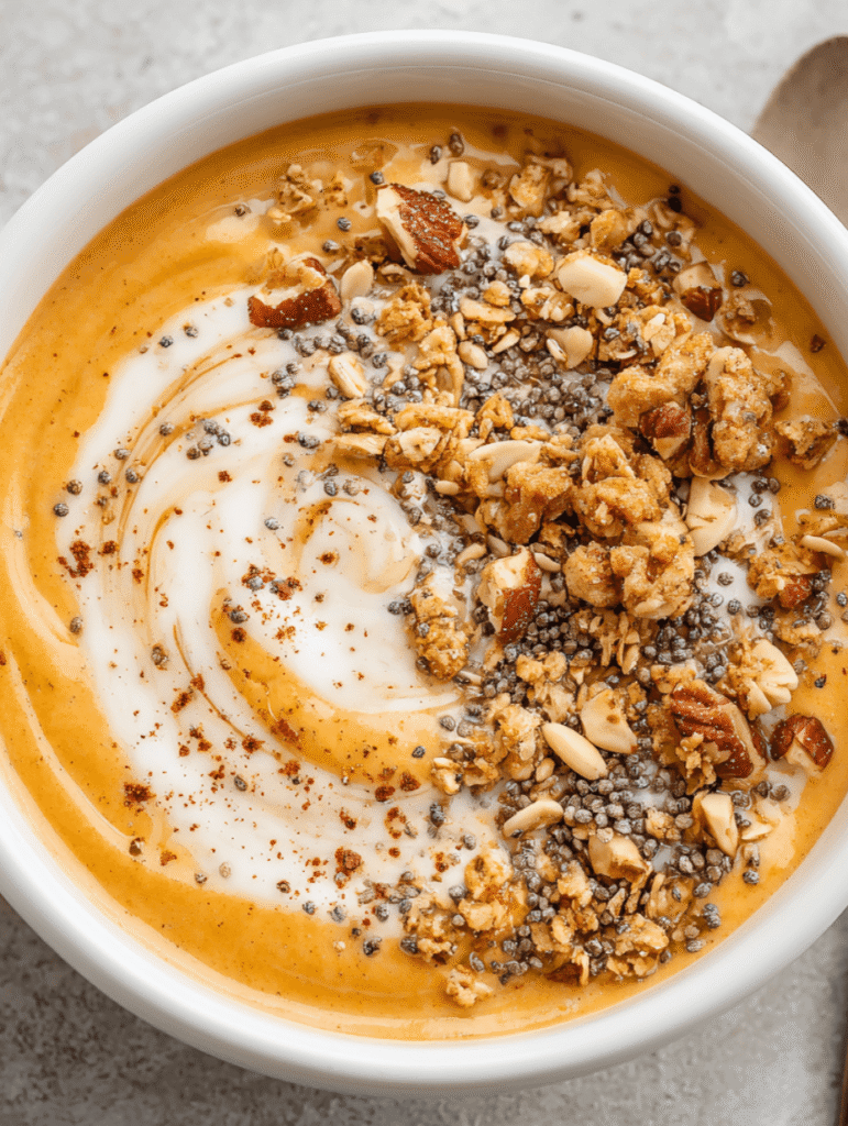 This bowl is a “cheat code” for satisfying a dessert craving in a way that actually fuels your morning. By folding real pumpkin puree and warming spices into thick Greek yogurt (or blended cottage cheese), you create a velvety, mousse-like texture. It’s comforting, vibrant, and takes less than three minutes to whip together.
