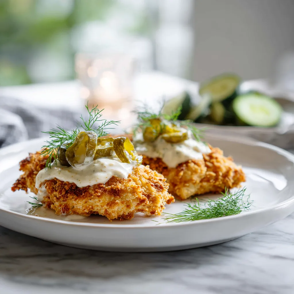 Crispy Dill Pickle Chicken with Creamy Garlic Sauce – The Ultimate Crunchy Comfort Food Recipe.