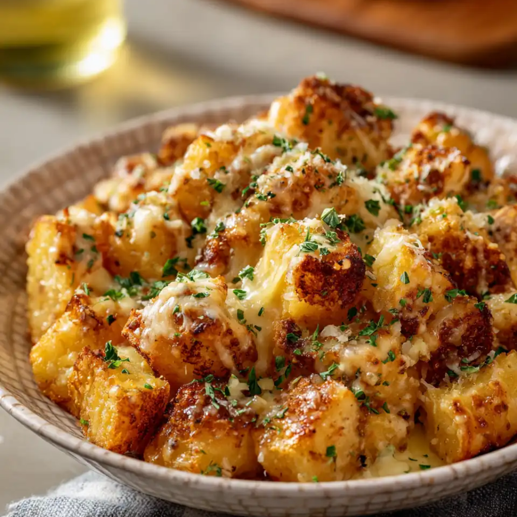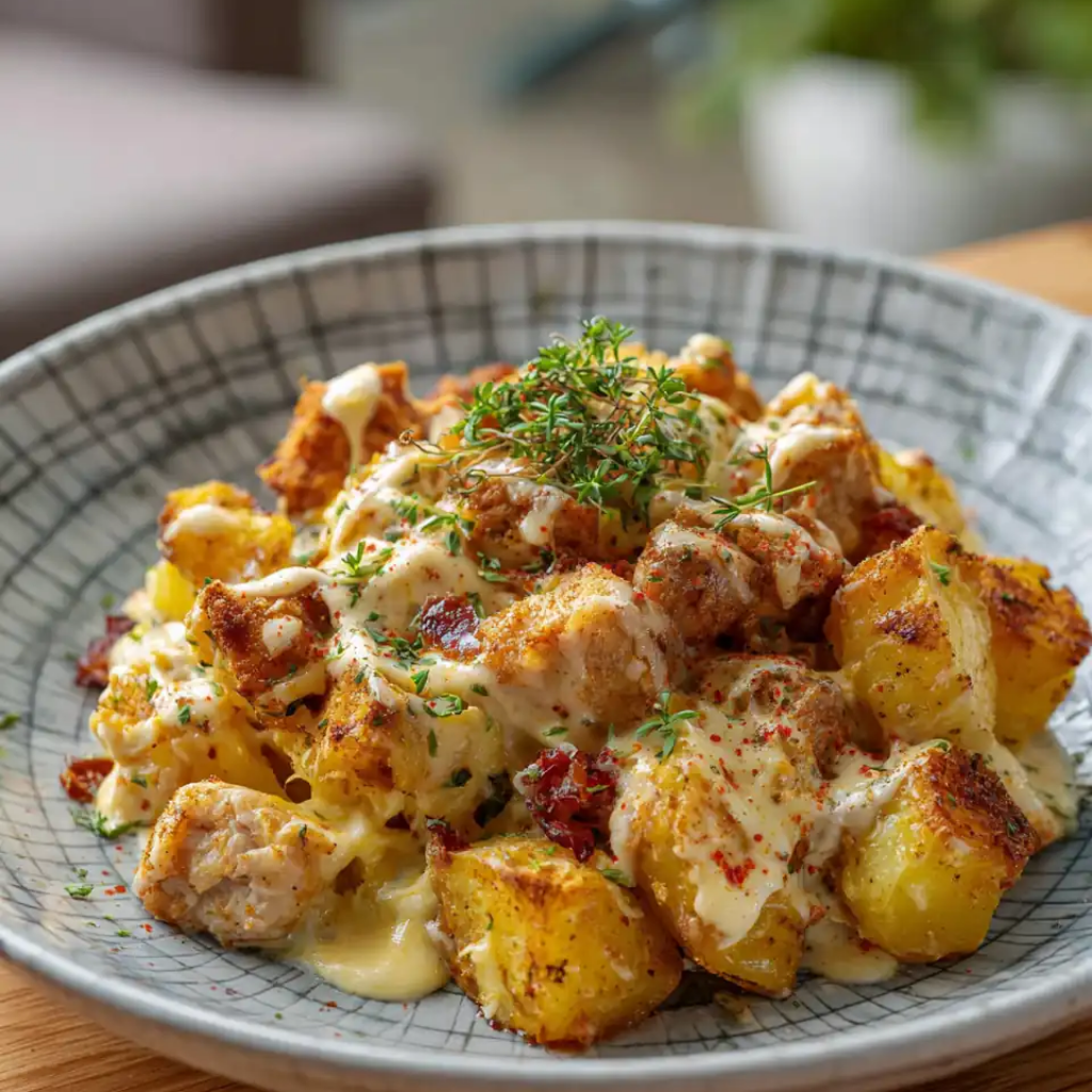 The garlic gives the sauce its depth, the Parmesan brings a nutty, salty richness, and the cream ties everything together into a silky coating that clings beautifully to both chicken and potatoes.
