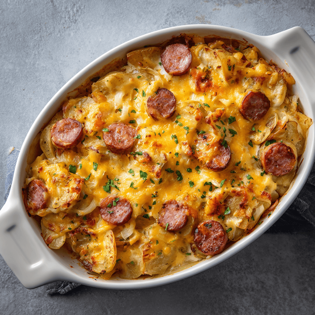 I developed this smoked sausage casserole during a particularly chaotic period when my family needed real meals but I had zero energy for complicated cooking. The beauty lies in its simplicity: sliced potatoes, smoky sausage, plenty of cheese, and a creamy sauce that brings everything together. Everything bakes in one pan, the oven does the work, and you end up with a bubbling, golden casserole that satisfies everyone from picky kids to hungry adults.