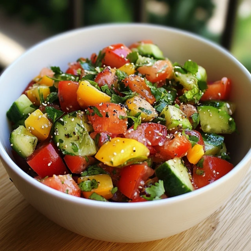 This salad hits all the right notes when it comes to both flavor and texture. The cucumber provides a clean, refreshing crunch that forms the backbone of the dish, while the cherry tomatoes add bursts of sweet acidity. The red onion brings a sharp bite that mellows slightly when dressed, and the chickpeas contribute a creamy, nutty element that makes this salad genuinely filling.
