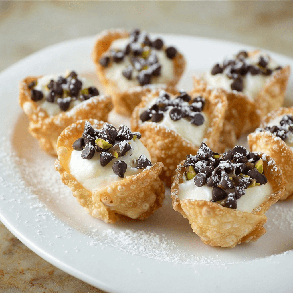 - The “Cannoli Nachos” Hack: If you don’t want to make cups, bake the wonton wrappers flat (cut into triangles), sprinkle with cinnamon sugar, and serve the cannoli cream as a dip in the center.