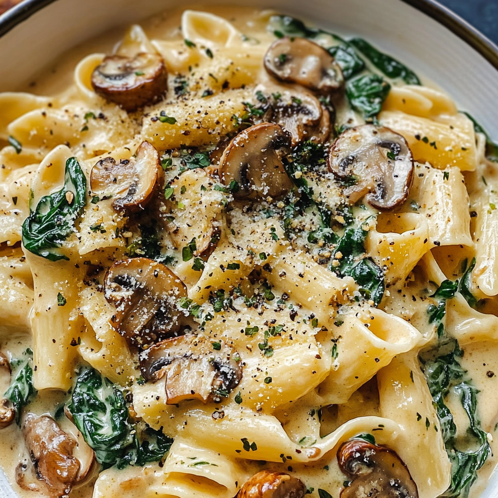The spinach doesn’t just add color; it brings a mineral brightness that cuts through the richness of the Parmesan and cream. As it wilts, it releases just enough moisture to help create the light sauce that binds everything together. The texture contrast is particularly satisfying – tender pasta, silky spinach, and mushrooms that retain just enough bite to remind you they’re there.