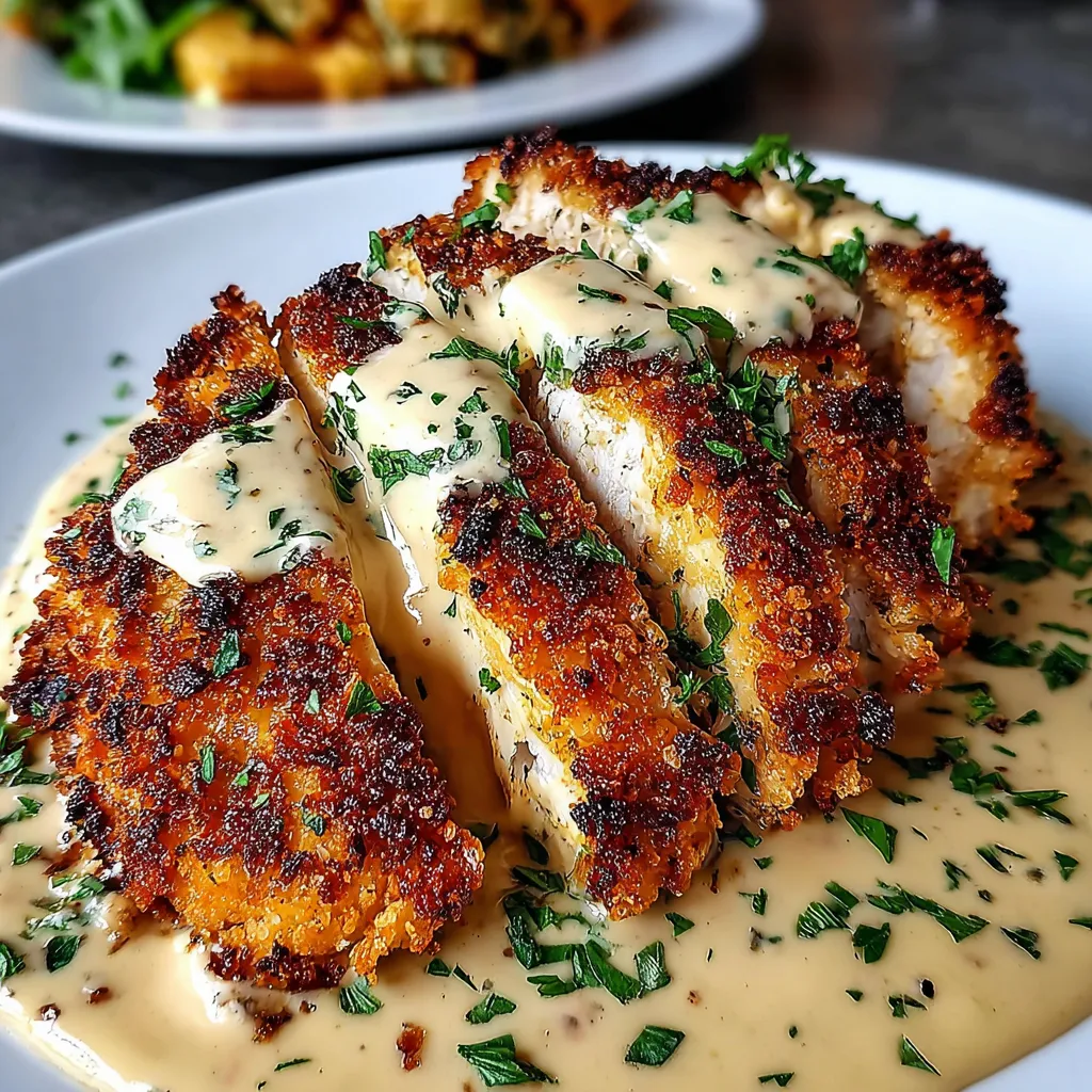 Parmesan Crusted Chicken with Creamy Garlic Sauce – Crispy, Juicy & Full of Flavor.