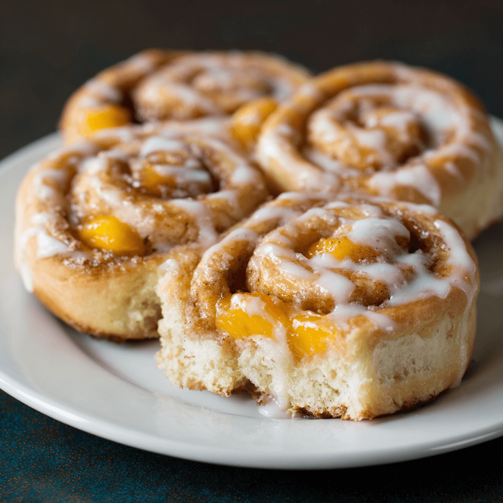 Peach Pie Cinnamon Rolls: Soft, Fruity, and Glaze-Topped Bliss.