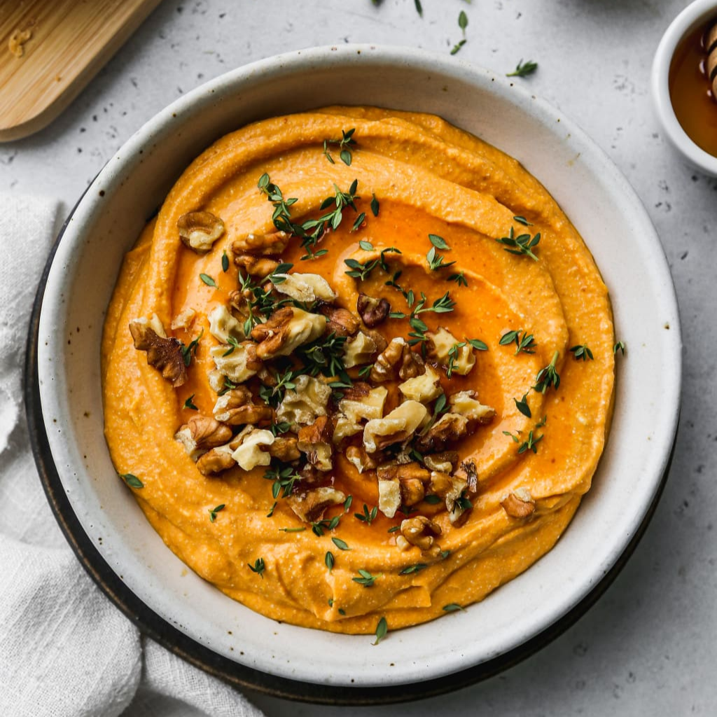 For the garnish, quickly toast the pumpkin seeds in a dry skillet over medium heat for 2-3 minutes until they’re golden and fragrant. Let them cool slightly, then toss with a drizzle of honey and a pinch of flaky salt. Scatter these over the dip along with fresh herbs for color and texture contrast.