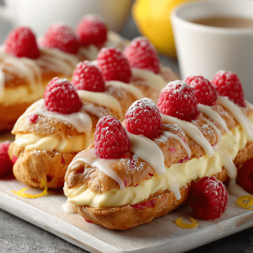 4. Set and Serve: Place the glazed éclairs on a wire rack and allow the glaze to set (about 30 minutes). Garnish with a few fresh raspberries or lemon zest curls. Serve immediately or store in the refrigerator.