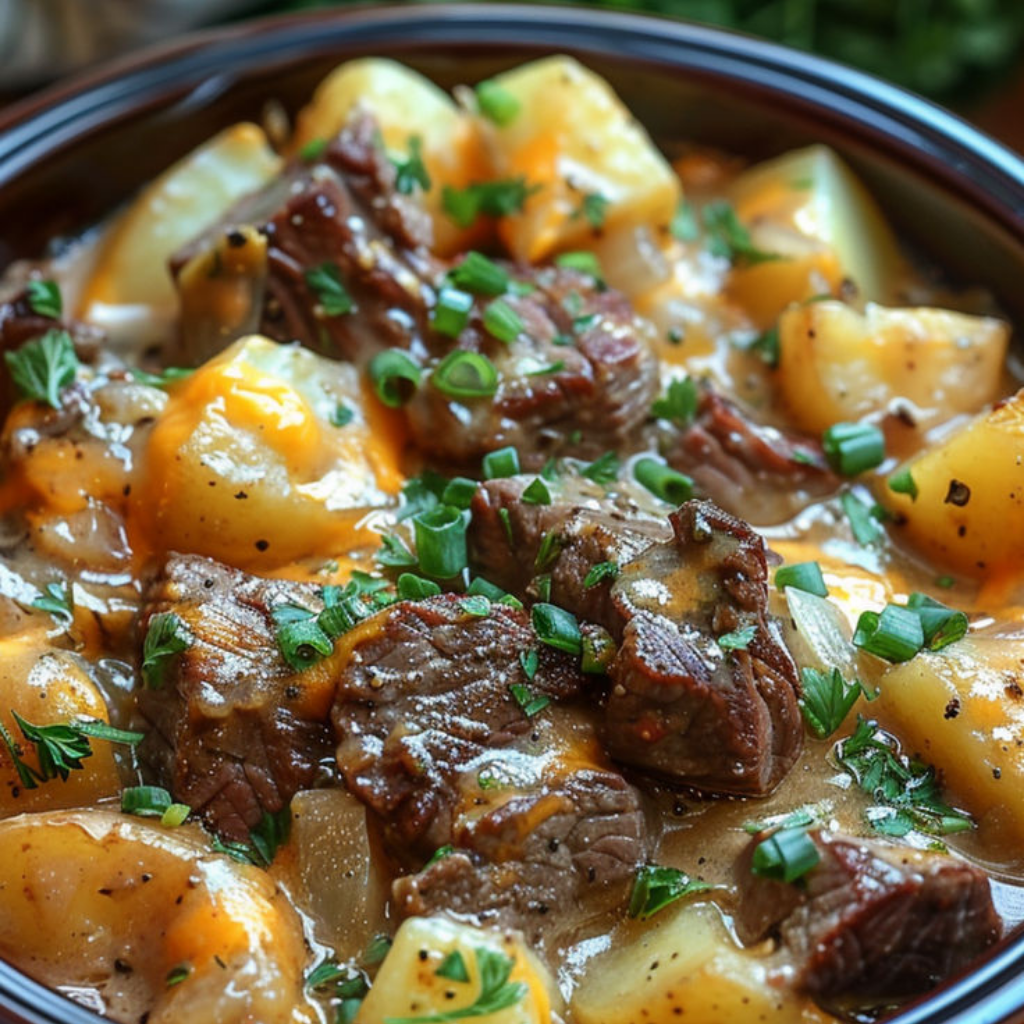 This recipe started as a happy experiment one chilly weekend. I had a couple of inexpensive steaks in the fridge, a bag of russet potatoes, and not much time to fuss over the stove. Instead of pan-searing everything separately, I layered the ingredients in my slow cooker, set it, and walked away. Hours later, the house smelled incredible, and inside the pot was a perfectly cooked casserole with buttery potatoes, juicy steak, and gooey cheddar cheese all melded together.