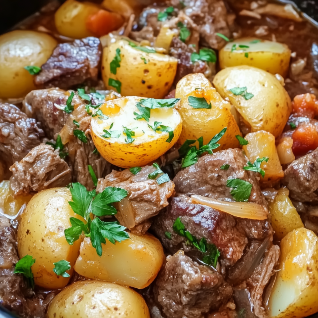 Cover and cook on LOW for 6–7 hours or HIGH for 3–4 hours, until the potatoes are tender and the steak is cooked through.