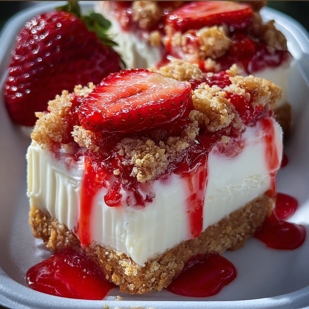 These cheesecake chunks deliver everything you want in a great dessert—rich, tangy creaminess from the perfectly smooth cheesecake layer, buttery crunch from the graham cracker base, and that amazing textural contrast from the strawberry crunch topping.