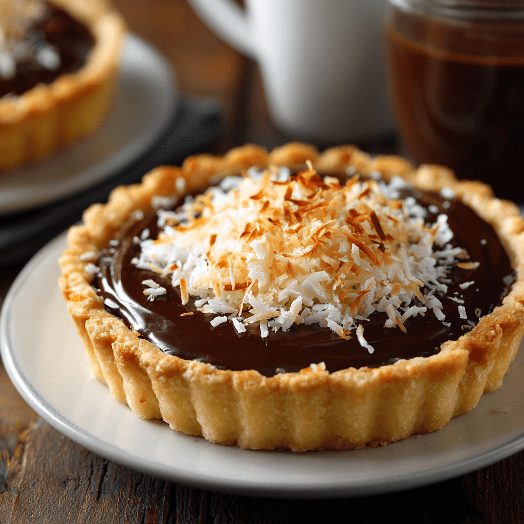 This toasted coconut chocolate tart pairs a crisp cocoa shortcrust with a baked, custardy chocolate filling that sets silky and sliceable. The key techniques are working cold butter into the crust for a tender snap, tempering eggs into warm ganache for a smooth bake, and finishing with golden toasted coconut for texture and aroma.