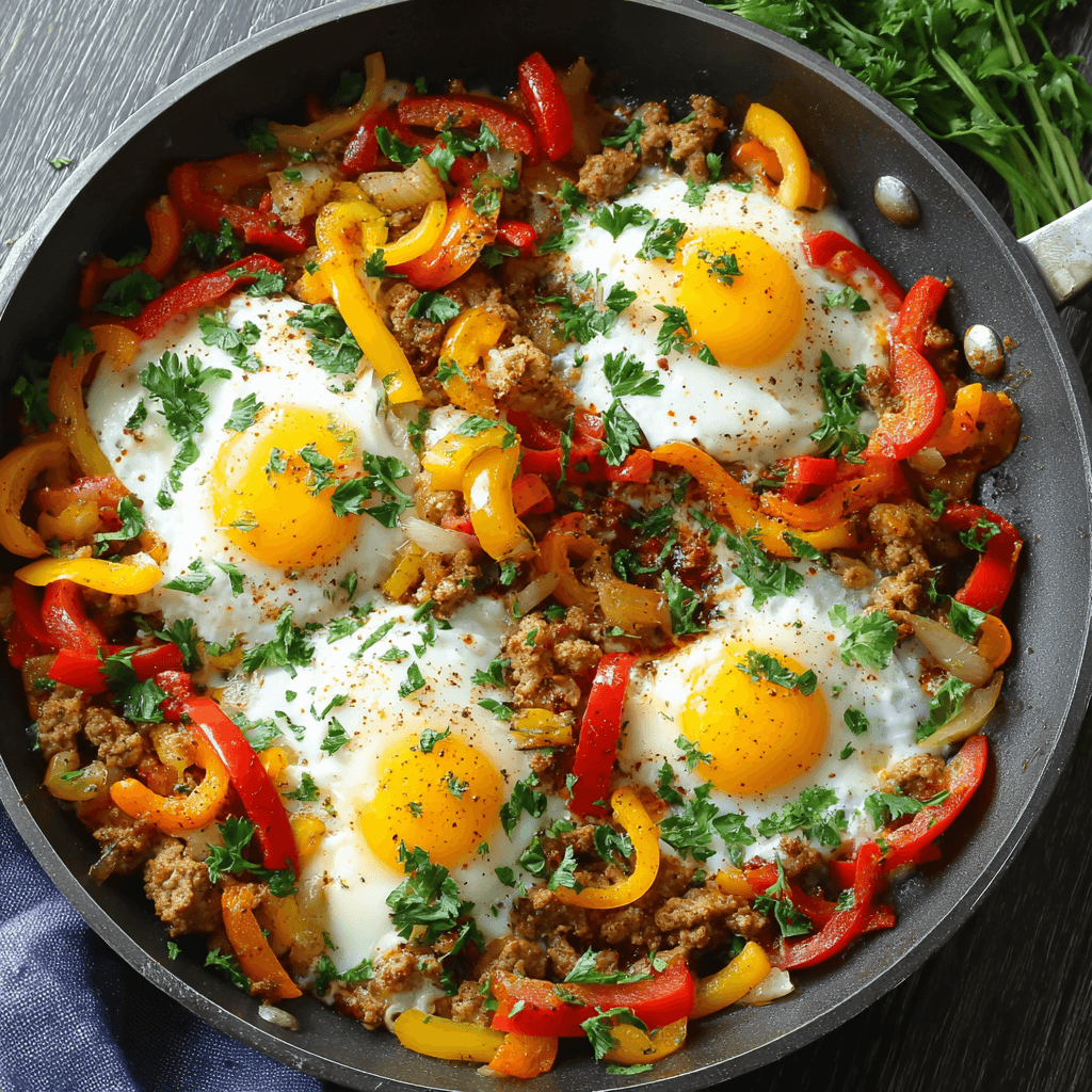 This dish replaces traditional heavy sausage or bacon with lean ground turkey, which is seasoned boldly and browned until crumbly and savory. The turkey forms the hearty base, nestled beneath tender, wilted vegetables (like spinach or bell peppers) and bright, sliced mushrooms. The entire mix is then topped with fresh eggs, which are baked or covered until the yolks are perfectly runny and the whites are just set.